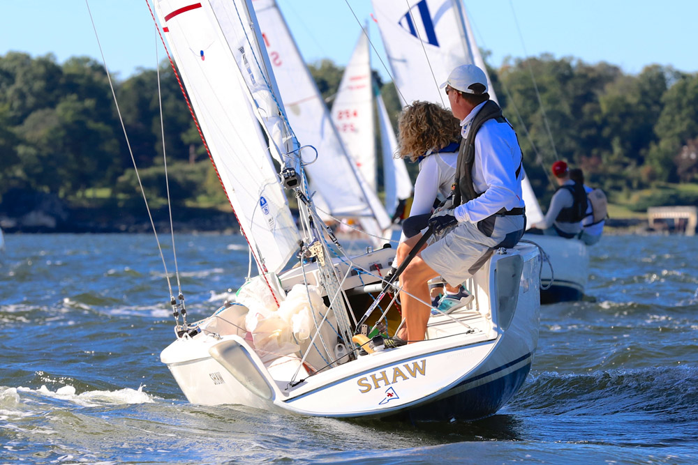 Main trim is more important than jib trim in all conditions. Keep the vang loose in light air. When both crew are sitting on the deck, the vang may be pulled harder to bend the mast and open the narrow slot. Above 15 knots, pull the vang as hard as possible and be prepared to use the sheet agressively. The main likes a tight outhaul. The cunningham is a floating tack. Trim it such that no hardlines radiate from the forward end of the bolt rope in the boom slot. There is no main traveler; a fixed, non-adjustable bridle is placed above the tiller.