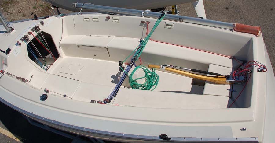 Cockpit Huge 11'6" self-bailing cockpit with full-length seats, angled seatbacks. Seats 8 adults in comfort. Adjustable mainsheet traveler amidships.
